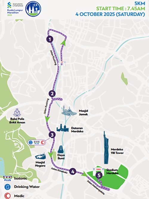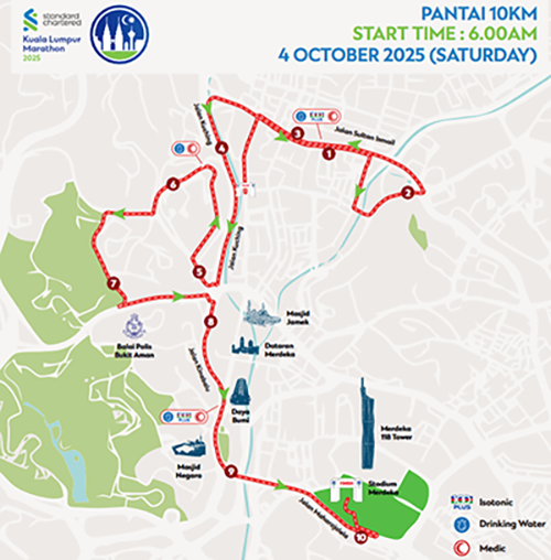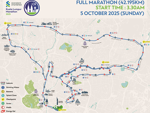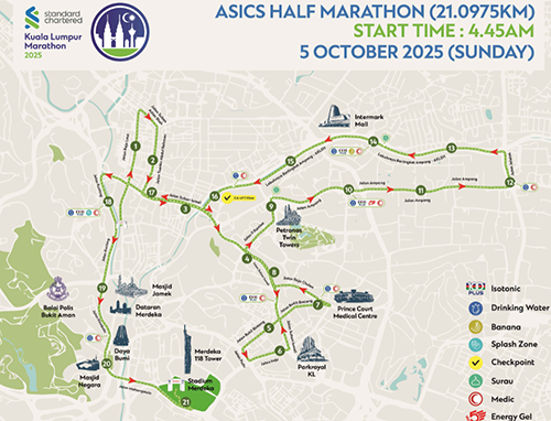 - 全馬、半馬、10公里、5公里、2公里均在拉惹勞特路(Jalan Raja Laut)